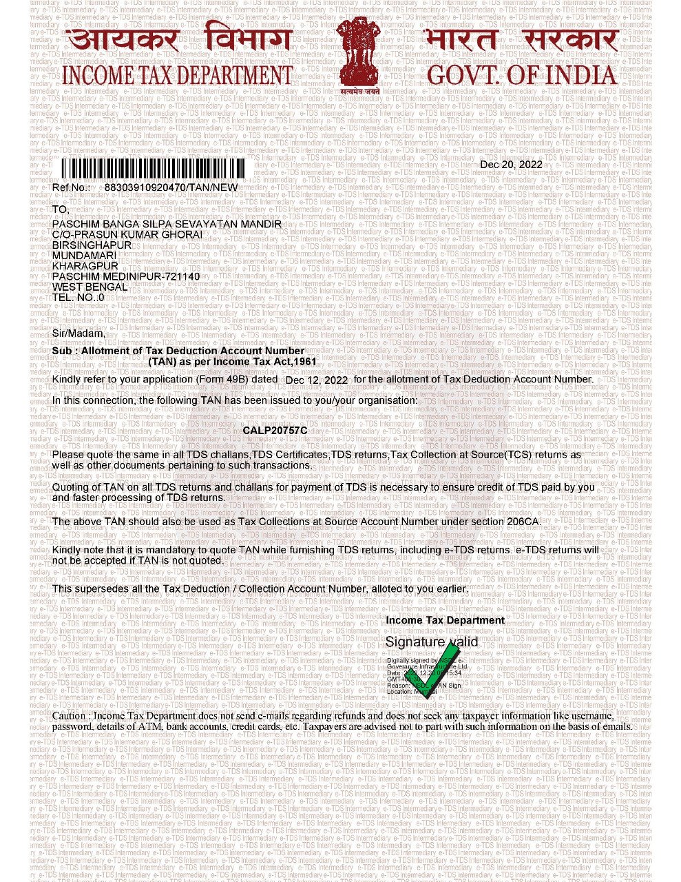 | 2093 | Income Tax Registration | ALL INDIA LEGAL SERVICES MEDIATION TRUST, C/O- Mahuya Mukherjee | At.- Qr no - F 39, Street - V (Five), Post Office- Farakka Barrage Project, P. S- Farakka, District.- Murshidabad- 742212 | ||||||