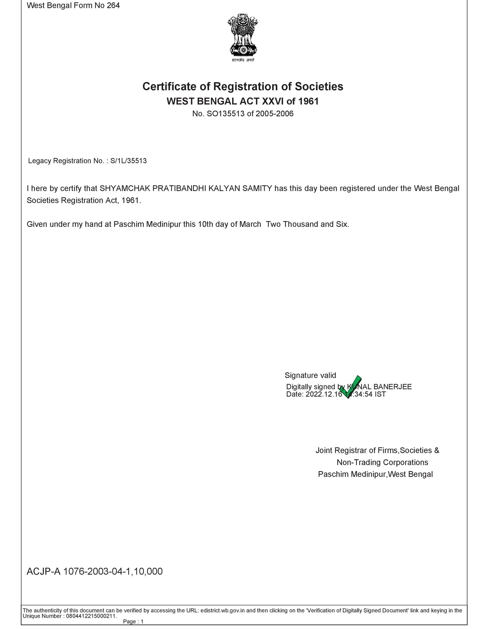 SHYAMCHAK PRATIBANDHI KALYAN SAMITY, C/O-BABLU MANIK | Vill.- Gourhati, P.O-Shyamchak, P.S-Kharagpur Local, Dist.-Paschim Medinipur, W.B.-721301 | ||||||